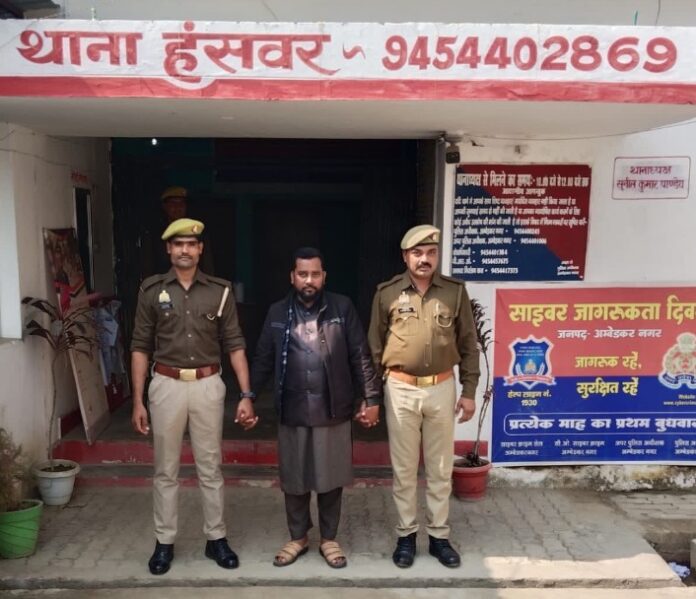 हंसवर,अंबेडकर नगर। झाडफूक, दुआ ताबीज के बहाने धर्म परिवर्तन करने वाले व्यक्ति आरोपी को गिरफ्तार कर जेल भेजा गया। हंसवर थाना क्षेत्र के तरौली मुबारकपुर निवासी अरुण कुमार की तहरीर पर दर्ज मुकदमा संख्या 43/24 धारा 3(5) 1उ प्र विधि विरुद्ध धर्म संपरिवर्तन प्रतिशेष अधिनियम 2021 के आरोपी को गिरफ्तार कर जेल भेजा गया। मुकदमा पंजीकृत करने वाले वादी का दावा है कि, आरोपी शमशीर खां पुत्र रफीक खान निवासी ग्राम सेमउर खानपुर (पकड़िया का पूरा) दुआ, ताबीज, झाड़ फूंक का कार्य करता है। और उसके द्वारा काजीपुर ग्राम निवासी अनुसूचित जाति के वृतन्ति पुत्र रामतीरथ को बहला फुसला व लालच देकर धर्म परिवर्तन कर दिया गया। जिसके कारण व्यक्ति वृतांती मुस्लिम धर्म के अनुसार नमाज पढ़ने लगा। और अपना रहन-सहन इस्लाम धर्म के अनुरूप कर लिया। हंसवर पुलिस द्वारा समाजसेवी अरुण कुमार की तहरीर पर मुकदमा पंजीकृत करते हुए आरोपी शमशीर खां को गिरफ्तार का न्यायालय में पेश कर जेल भेजा गया।