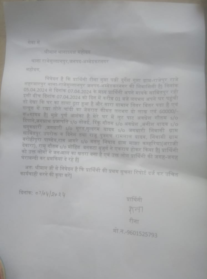 हंसवर/आलापुर/अम्बेडकर नगर। सी ओ सर्किल आलापुर थाना क्षेत्र राजेसुल्तानपुर अंतर्गत ग्राम राजेशहरयार पुर निवासी रीना गुप्ता पत्नी दुर्गेश गुप्ता बीते शुक्रवार से रविवार तक अपने मायके कुछ आवश्यक कार्य से गयी थी लेकिन जब रविवार को दोपहर लगभग एक बजे अपने मायके से घर वापस लौटी तो उनके घर का ताला टूटा हुआ था एवं घर में रखा सामान तितर बितर पड़ा था। मालूम हो घर की हालत देख पीड़िता के होश उड़ गए घर में घुसकर चोरों ने नकदी, जेवरात सहित लाखों रुपए की सामान चुरा ले गए थे। पीड़िता ने थाना प्रभारी राजेसुल्तानपुर को दिए गए प्रार्थना पत्र में गांव के कुछ मनबढ़ किस्म के लोगों पर आरोप लगाते हुए शिकायत किया है कि संदुक में रखा जेवरात और लगभग दो लाख साठ हजार रूपए की चोरी हुई है। चोरी कि घटना से डरी सहमी पीड़िता रीना गुप्ता बार बार चक्कर खाकर अचेत हो जा रही है । पीड़िता का कहना है कि शिकायत पत्र में दर्शाए गए मनबढ़ लोग बीते दिनों मायके वालों से मारपीट कर जान से मारने की एवं चोरी की घटना को अंजाम पहुंचाने को कहा था। पीड़िता ने पुलिस को लिखित सूचना दिया है जिसपर कार्यवाही शुरू कर पुलिस मामले की छानबीन में लगी हुई है।