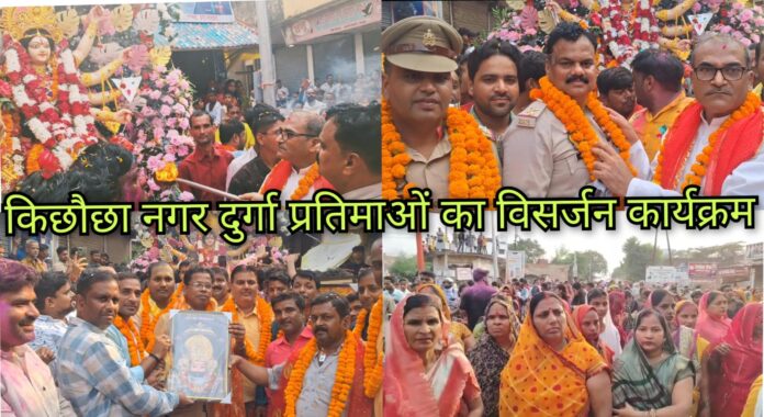 बताते चलें कि मातारानी नवरात्र के प्रथम दिन ही गोरखपुर और रसूलपुर दरगाह में विराजमान हो जाती हैं जबकि वहीं किछौछा में 1 अक्टूबर को। प्रथम नवरात्र से ही भक्त जनों का माता रानी के दर्शन करने का सिलसिला शुरू हो जाता है। बीते सोमवार को सभी पंडालों में विराजमान मां दुर्गा, मां काली और बाबा खाटू श्यामजी महाराज,राधाकृष्ण की मूर्तियों का विसर्जन के लिए भव्य शोभायात्रा निकाली गई जो पूरे नगर का भ्रमण करती है नगरवासी पुष्प वर्षा करते हुए किछौछा बाजार पहुंचने के उपरांत भव्य आरती का आयोजन किया गया एवं नगर के सम्मानित लोगों को जिसमें समाजसेवी केंद्रीय दुर्गापूजा अध्यक्ष भरतलाल गुप्ता (भरत भाई), संजय कश्यप,संतोष कसौधन,महेंद्र यादव,सूर्यभान गुप्ता, महेंद्र जायसवाल( टाइगर), वरिष्ठ भाजपा नेता चंद्रभान गुप्ता, मुकेश साहू,सभासद रामजी कनौजिया, साहिल सोनी,पप्पू चौरसिया,अमित मद्धेशिया(तीसरा मोर्चा),बबलू जायसवाल एवं चेयरमैन ओमकार गुप्ता प्रतिनिधि को माता शेरावाली, माता कालीजी,बाबा खाटूश्यामजी महाराज,मर्यादा पुरुषोत्तम भगवान श्रीरामचंद्र का चित्र भेंट कर माला पहनकर एवं अंग वस्त्र पहनाकर सम्मानित किया गया। के उपरांत शोभायात्रा बढते हुए जगह-जगह माता रानी की आरती उतारी गई।