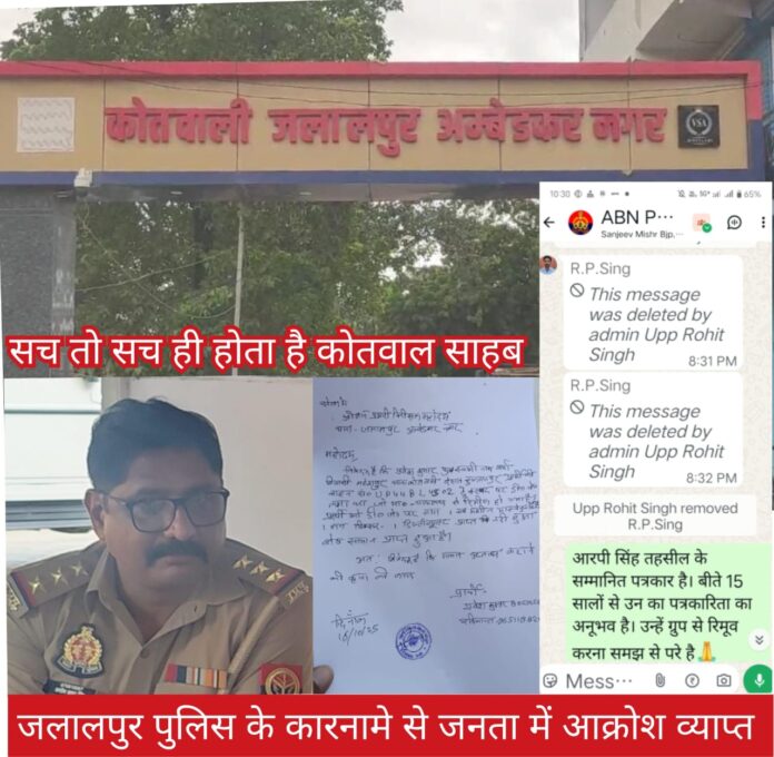 इसी सच्चाई को मीडिया ने उजागर कर दी तो सच्चाई उजागर होते ही कोतवाल जलालपुर संजय सिंह तिलमिला उठे आव देखा न ताव पूर्व में तैनात सिपाही रोहित सिंह जो कि वर्तमान में जलालपुर कोतवाली में तैनात भी नहीं है किसी गैर थाने में तैनाती है और ग्रुप का ग्रुप एडमिन भी है के द्वारा त्वरित रूप से सीनियर एवं सम्मानित पत्रकार आरपी सिंह को रिमूव कर दिया जाता है।